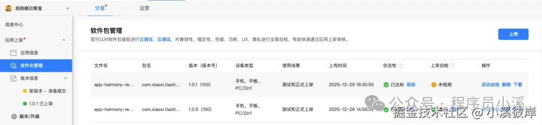 进入应用详情,选择【版本信息】新建一个版本,点击【上传】会跳到【软件包管理】页面上传安装包