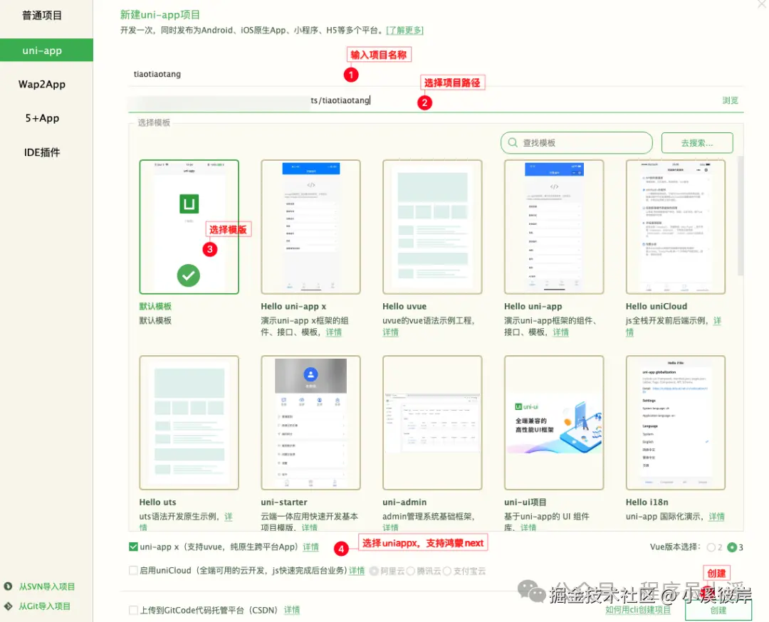 选择项目路径,输入项目名称,注意勾选【uni-app x】选项,点击【创建】创建项目