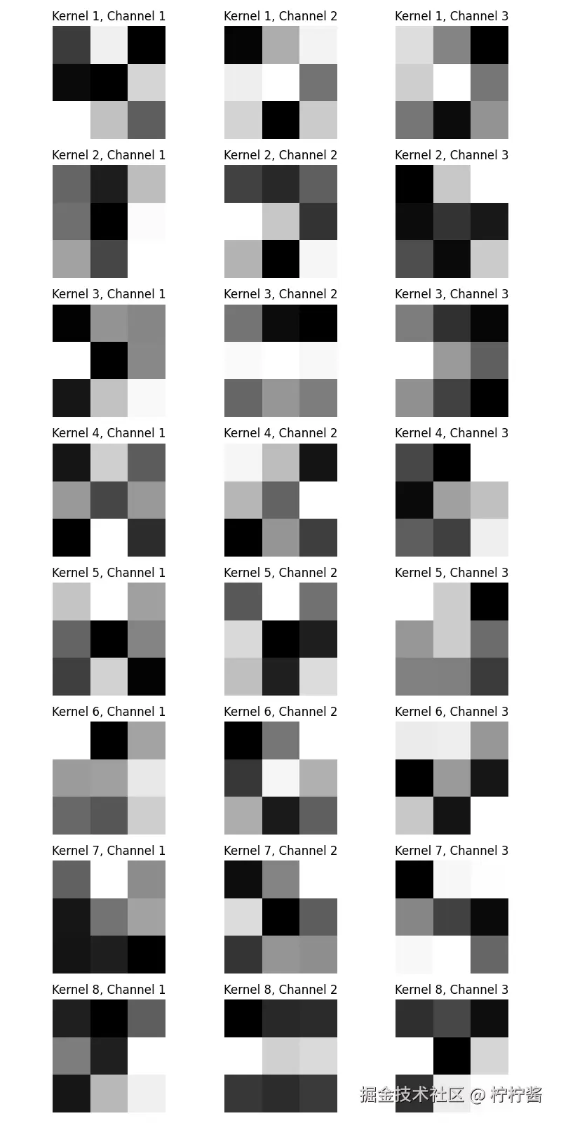 conv_weights = cnn_block.conv.weight.data # 形状:[16, 3, 3, 3](16个核,3通道,3×3)