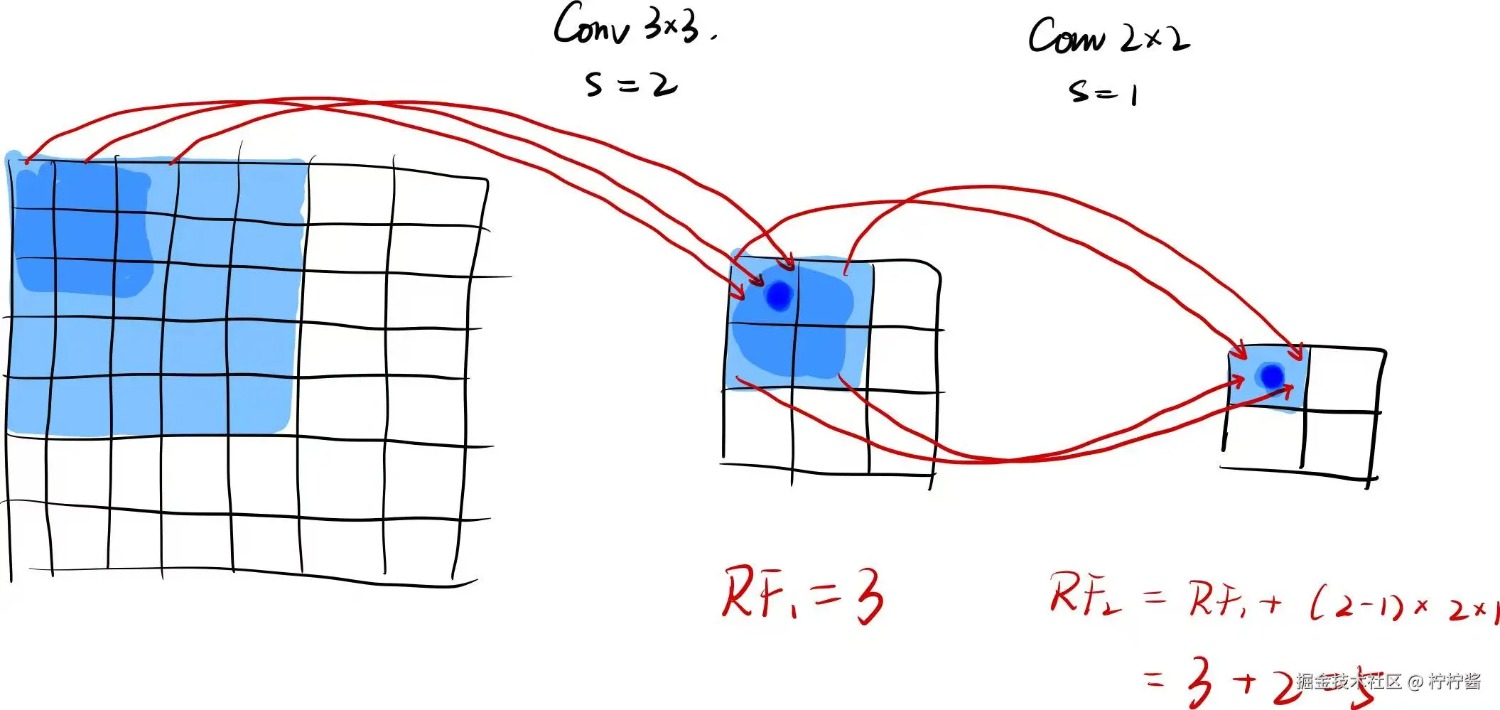 在单层卷积的基础上,叠加第二层卷积,就能直观看到感受野如何变大。多层卷积的感受野需要递归计算,公式如下:<math xmlns="http://www.w3.org/1998/Math/MathML"> R F n = R F n − 1 + ( k n − 1 ) × ∏ i = 1 n − 1 s i RF_n = RF_{n-1} + (k_n - 1) \times \prod_{i=1}^{n-1} s_i </math>RFn=RFn−1+(kn−1)×∏i=1n−1si
