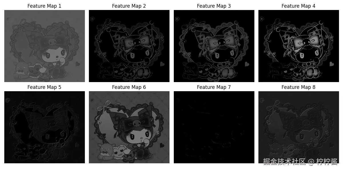 ✅ 直观结论:不同特征图对应不同的 "滤镜效果" ------ 有的亮区集中在中间,有的集中在边缘,这就是 CNN 提取的 "局部特征"。
