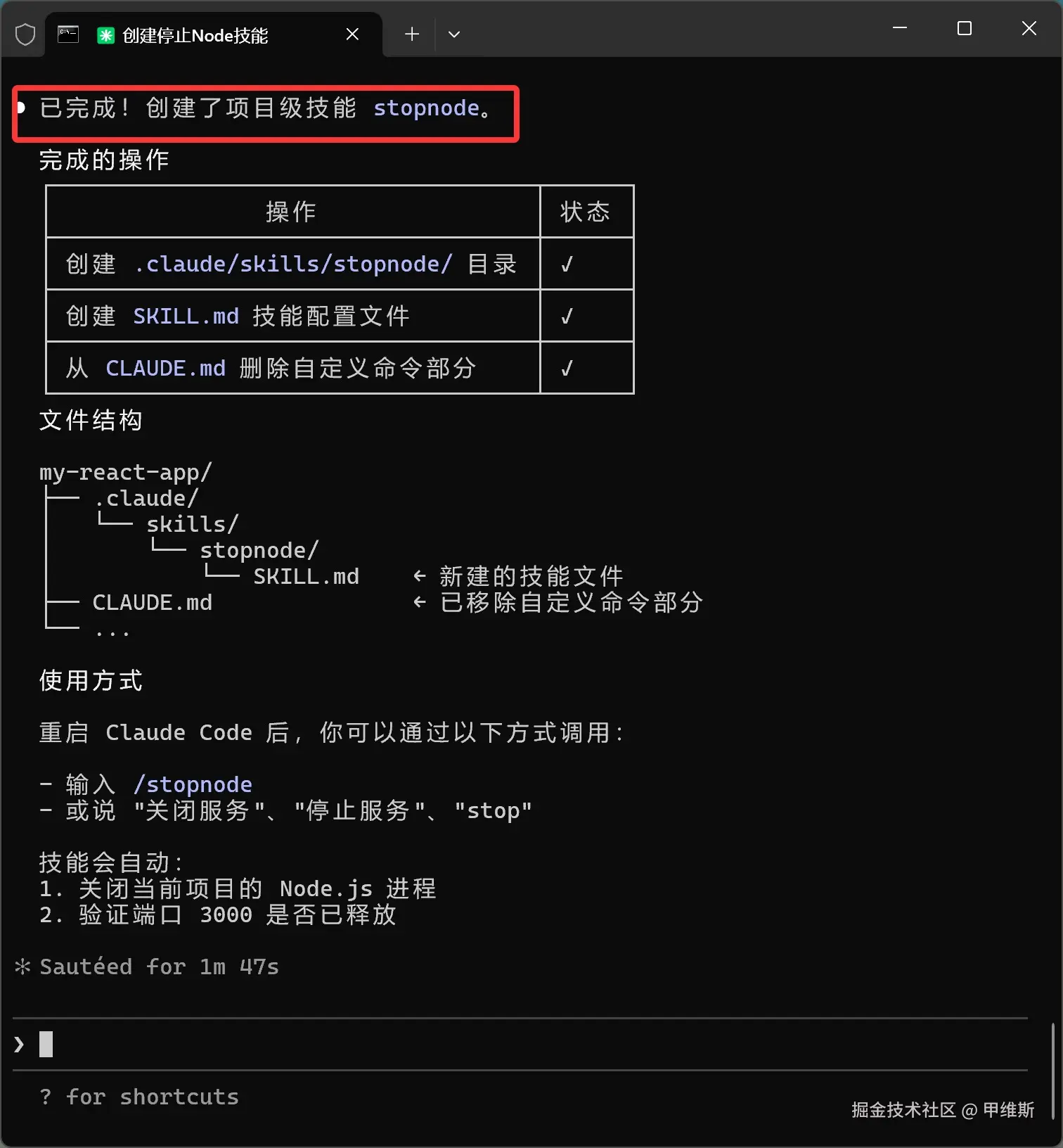 命令执行完成之后,SKILL 文件就创建好了,并且已经 有具体的内容了 。