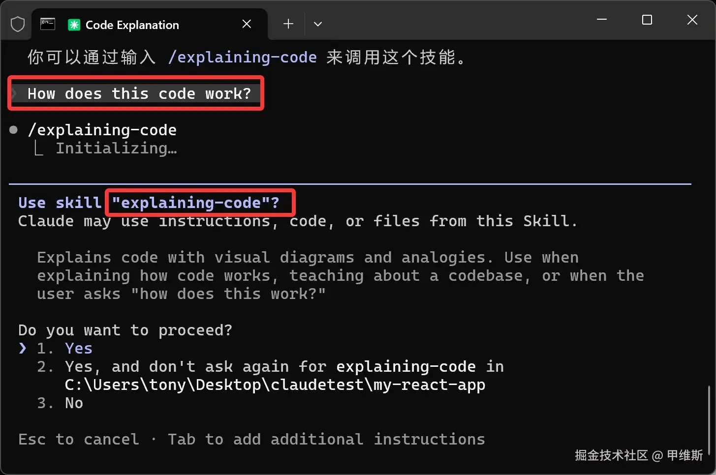 CC 会告诉你,当前可以用的技能是 explaining-code。