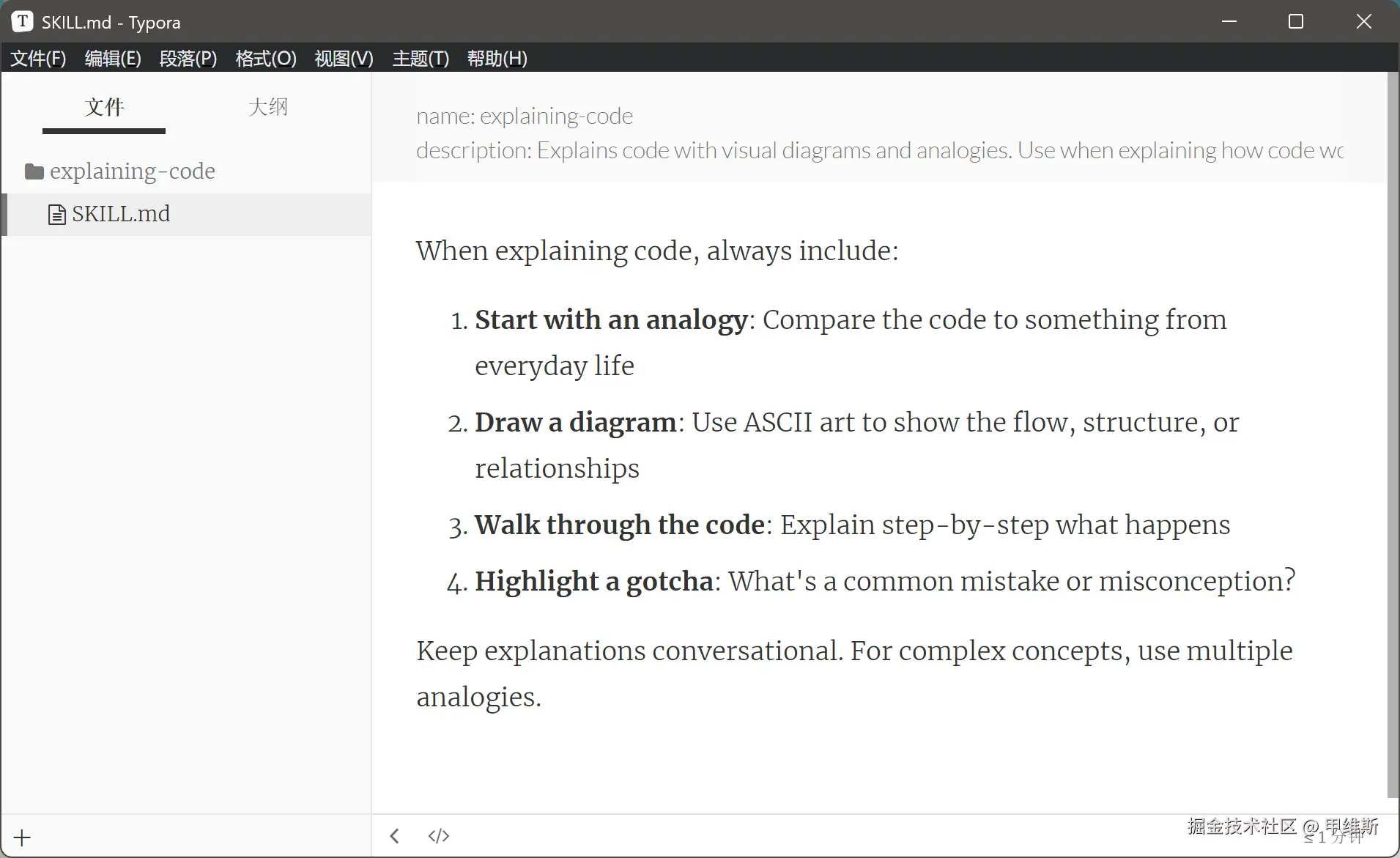 所以技能文件保存在用户目录下,技能名称为 explaining-code。