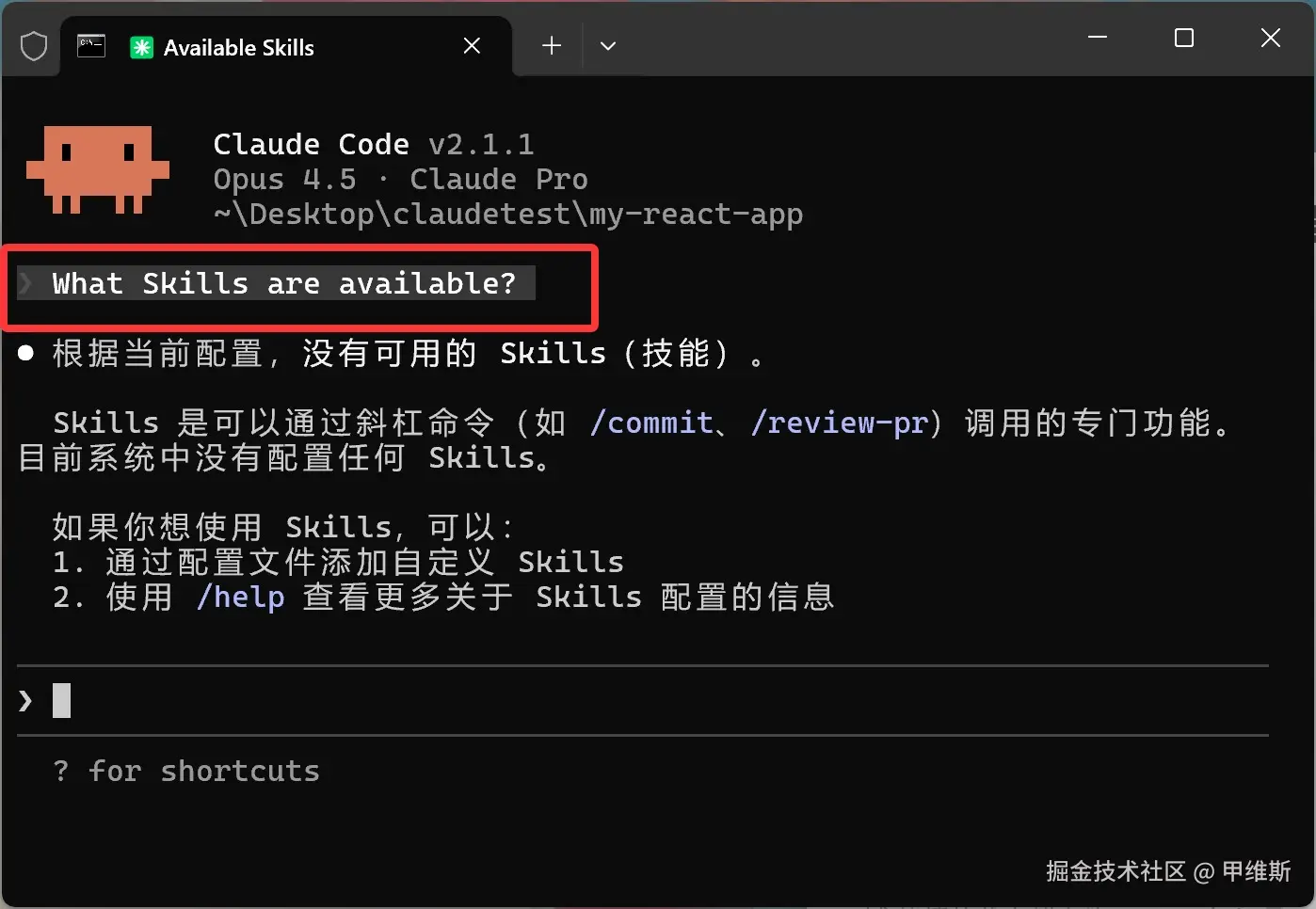 为了更加稳妥一下,我们可以让 CC 帮我们把技能列出来。然后看一看,是否已经包含了我们创建的技能。