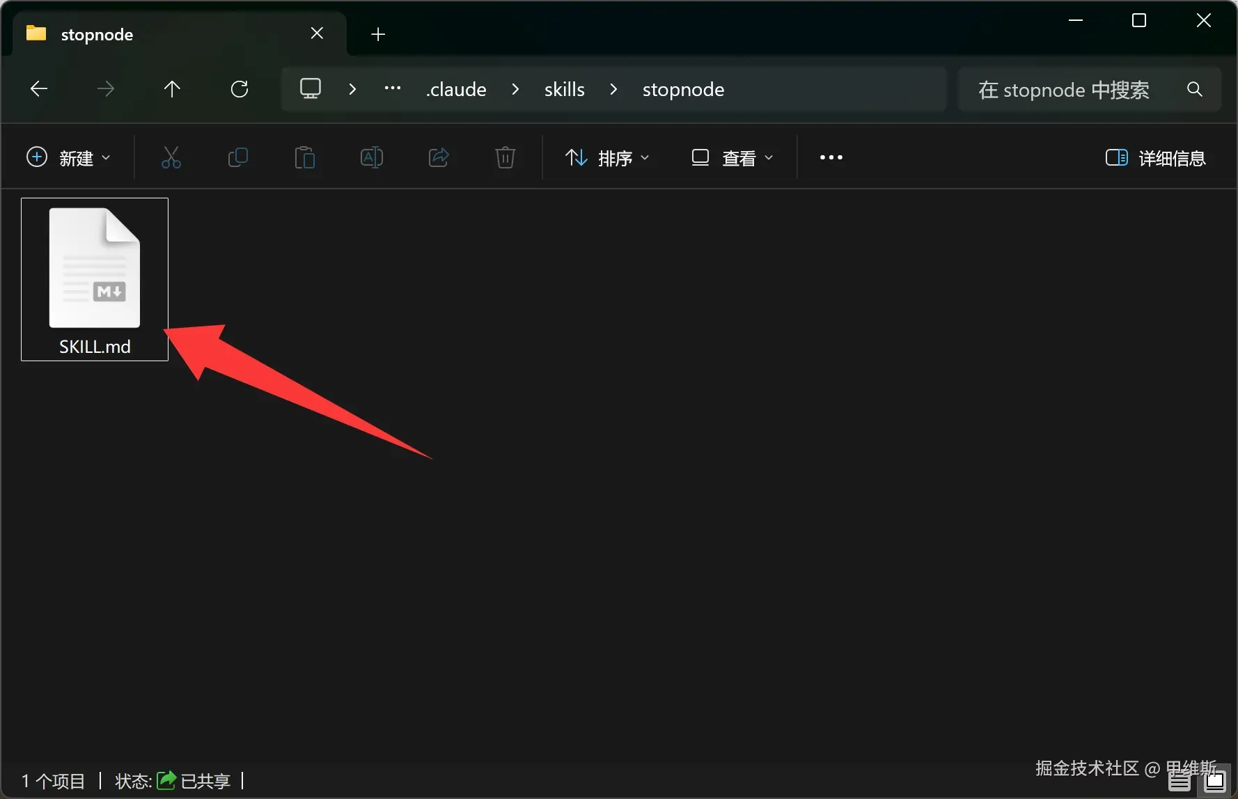 下面就是创建这个 SKILL.md 文件,然后把特定的内容写到里面。