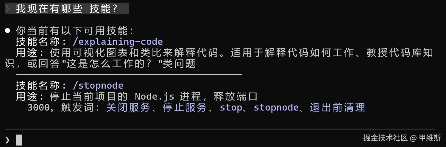 它就会告诉你有两个技能,一个是用户级别的代码解释技能,一个是项目级别的停止服务技能。
