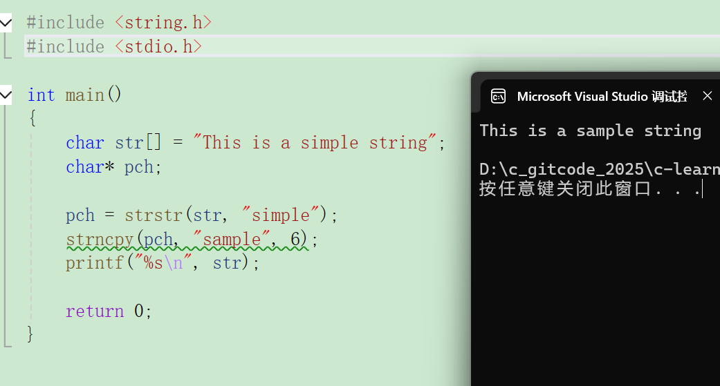 c#include <string.h> #include <stdio.h> int main() { char str[] = "This is a simple string"; char* pch; pch = strstr(str,"simple"); strncpy(pch,"sample",6); printf("%s\n",str); return 0; }