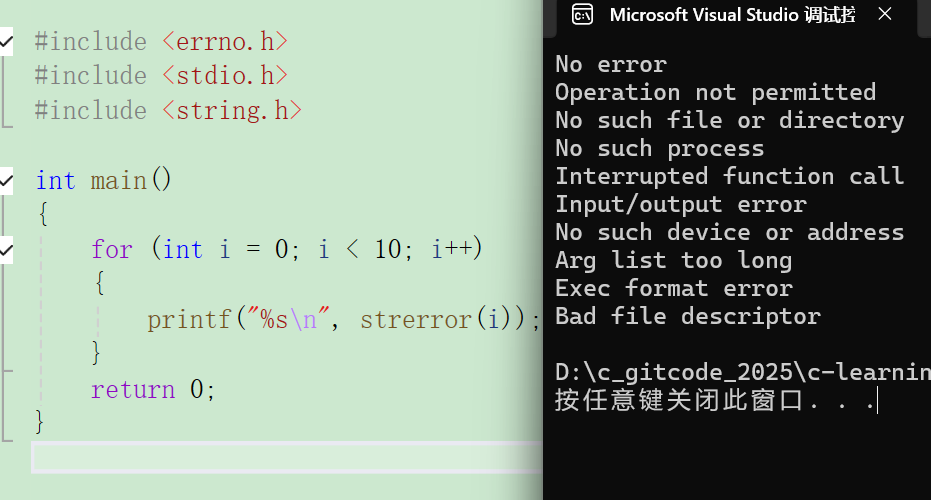 c#include <errno.h> #include <stdio.h> #include <string.h> int main() { for(int i = 0;i < 10;i++) { printf("%s\n",strerror(i)); } return 0; }