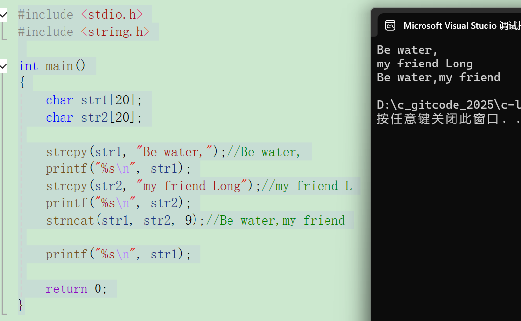 c#include <stdio.h> #include <string.h> int main() { char str1[20]; char str2[20]; strcpy(str1, "Be water,");//Be water, printf("%s\n", str1); strcpy(str2, "my friend Long");//my friend Long printf("%s\n", str2); strncat(str1, str2, 9);//Be water,my friend printf("%s\n", str1); return 0; }