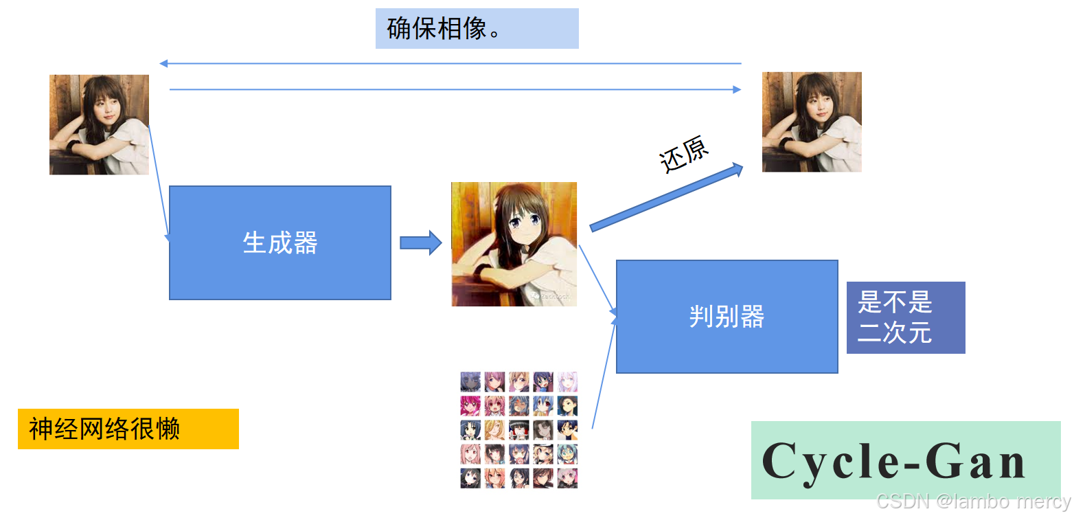 CycleGAN的工作流程中,最重要的一步就是,当将原始图片改动后,除去判断外,还需要将改动后的图片改回原始图片。这个步骤可以让生成的图片确保相像,经过不断的训练最终训练出"只改风格不改内容"的流程技巧。