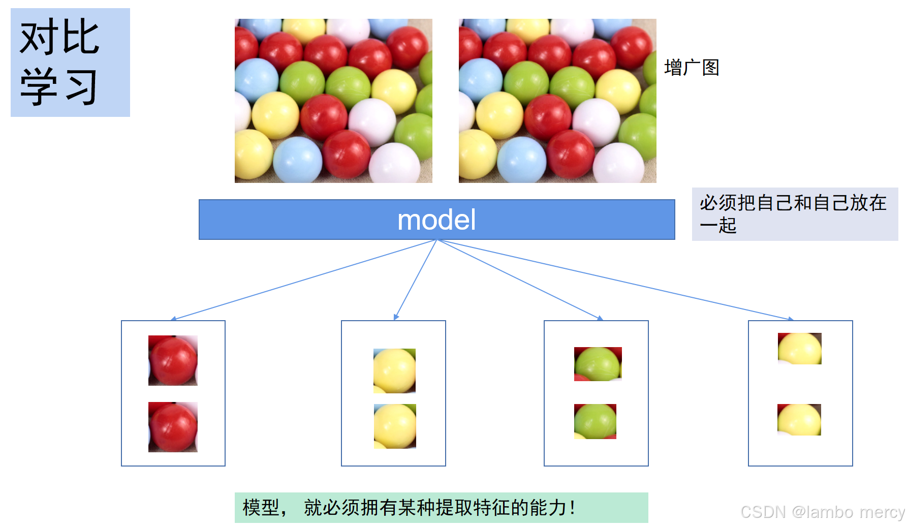 如下图,如果模型没有一点模型提取能力,就会把各个颜色的球给乱放,但使用了对比学习后就不一样了。使用对比学习,会将原图片进行增广,之后将自己与自己的增广放在一起,通过这种"靠近"和"远离"提高模型的提取特征能力。