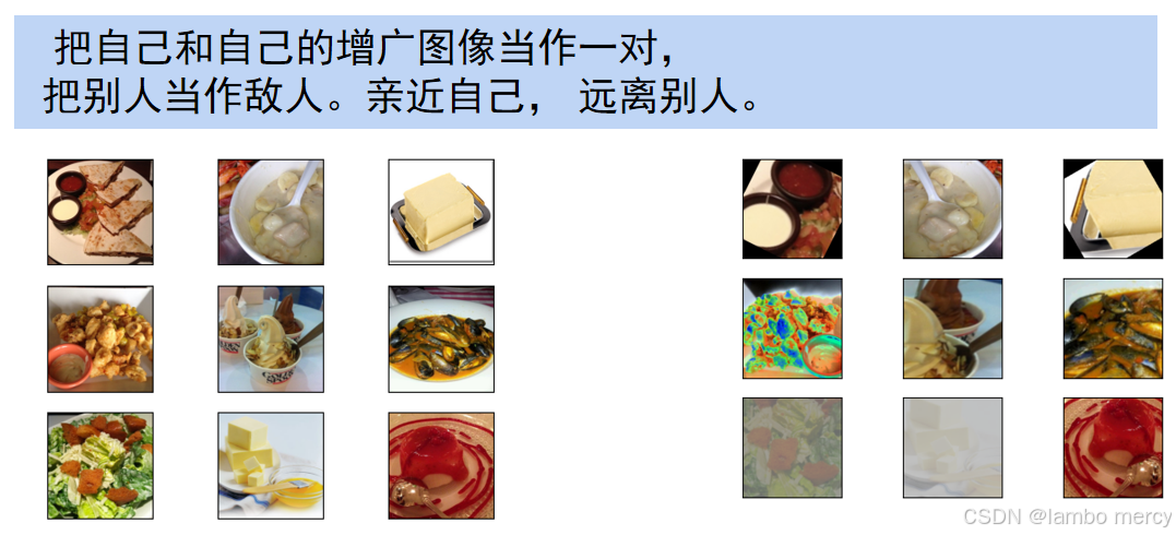 以对比学习(SimCLR, MoCo)为例 :对同一张图像做两种不同的随机变换(裁剪、变色等),得到两个"正样本对"。目标是让模型学会这两个不同视角下的特征是相似的,而与其他图像 的特征是不同的。这个过程迫使模型忽略无关的变换(如颜色偏移),而抓住图像的本质内容特征(如物体的形状、结构)。