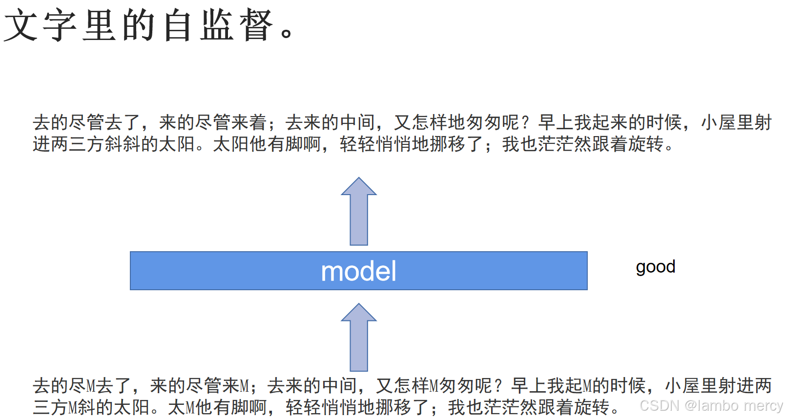 以BERT为例 :随机遮盖句子中的一些词,让模型根据上下文来预测被遮盖的词。为了准确预测,模型必须深入理解语言的语法、语义和上下文关系。这驱动它学习到极其丰富的语言特征。