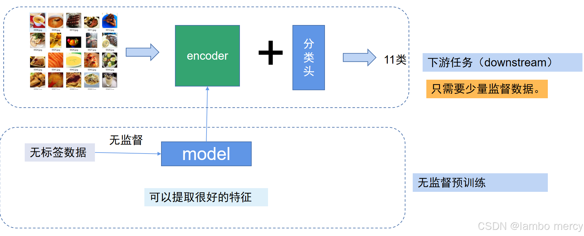 原本的无标签数据经过无监督学习进入模型后,可以提取到很好的特征。这个模型,我们就可以作为编码器与分类头一起使用去进行分类操作。除此之外,我们拥有提取特征的能力后,还可以应用到很多解决实际问题的方面,如 回归任务,生成任务,问答推理等,而这个解决实际问题的过程,我们称作下游任务(Downstream Task)