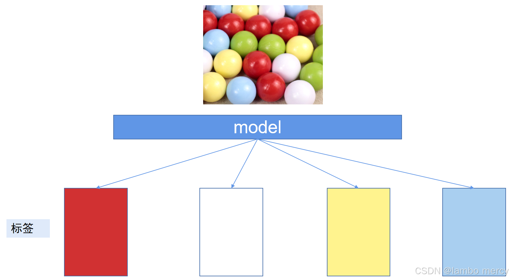 同样,下图若为带标签数据,可以根据不同标签对比,将形状相似的小球,按颜色分为不同的种类。