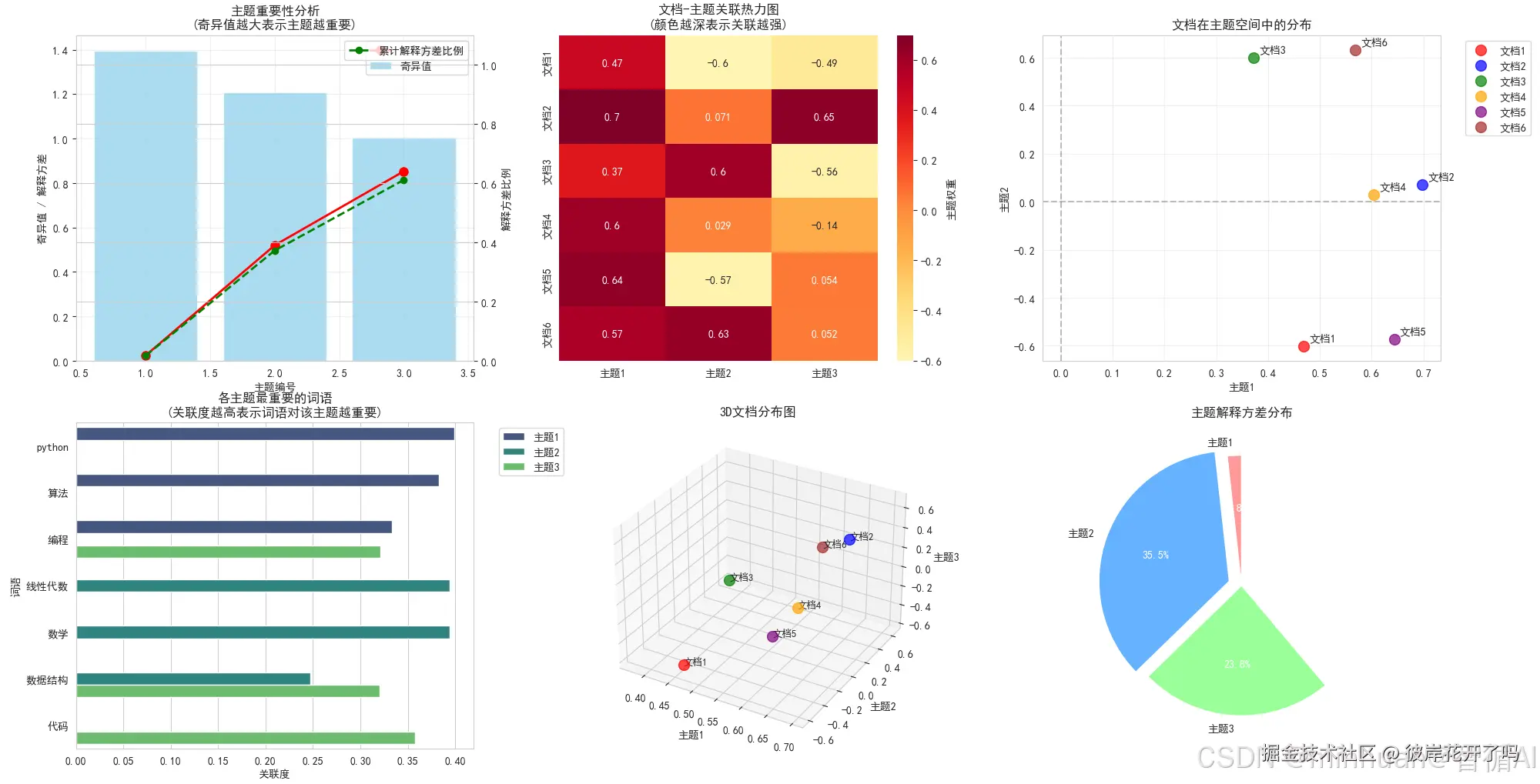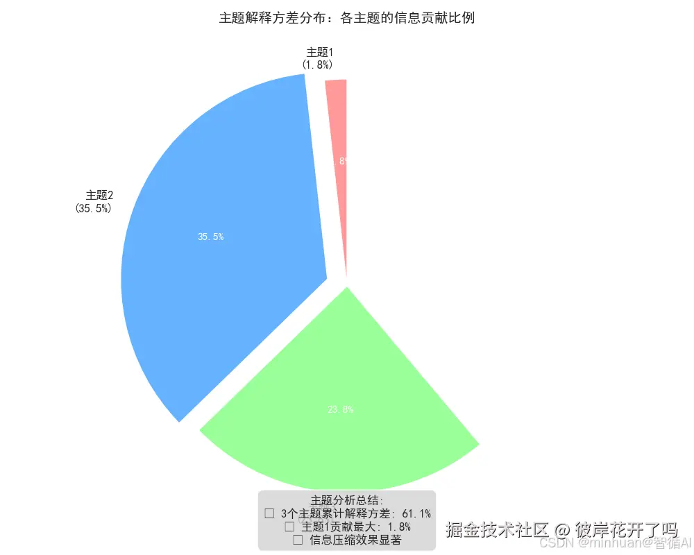 summary_text = f"主题分析总结:\n• 3个主题累计解释方差: {np.sum(explained_variance):.1%}\n• 主题1贡献最大: {explained_variance[0]:.1%}\n• 信息压缩效果显著"