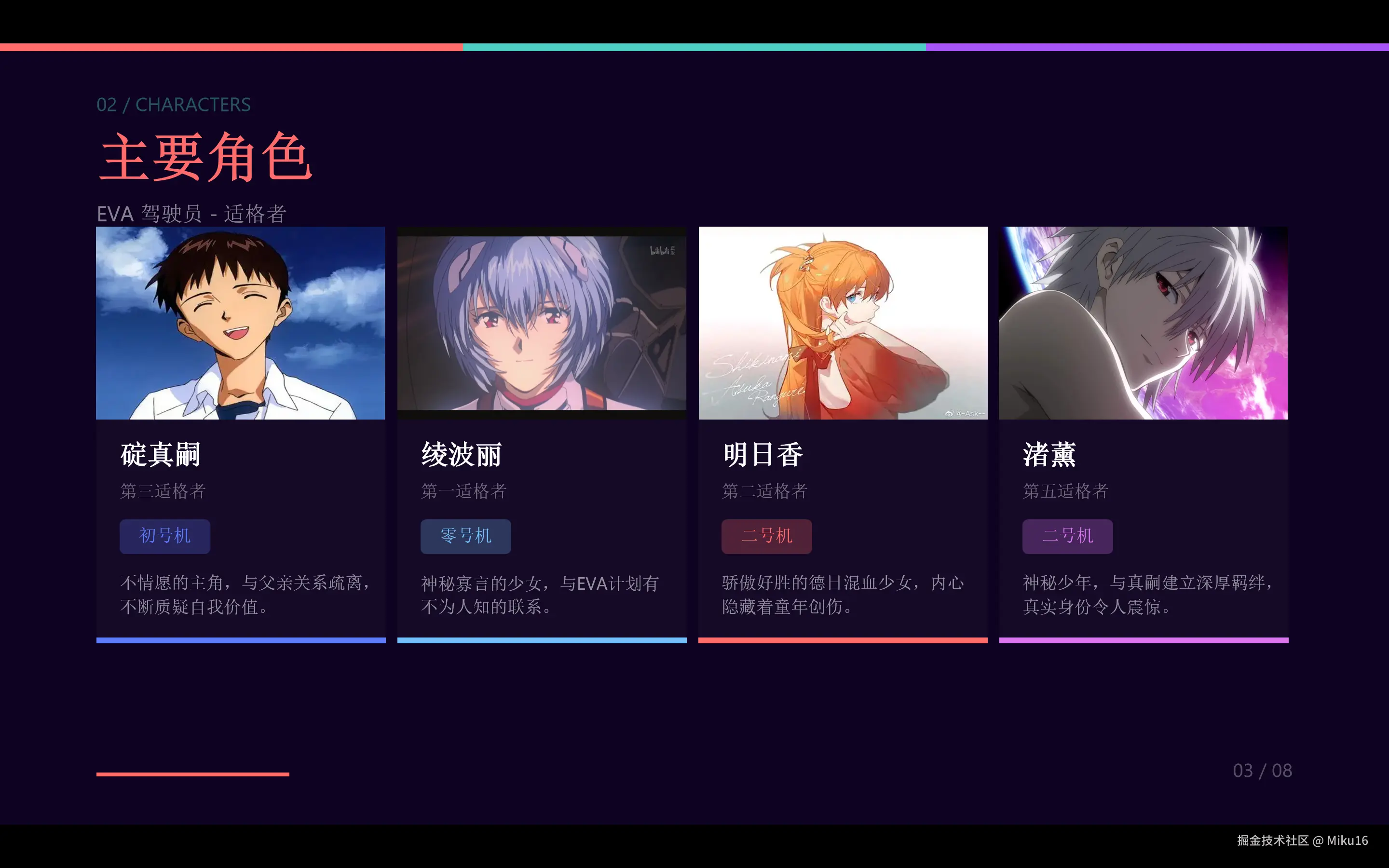 - 采用深紫色 + 青色 + 红色的 NERV 配色方案