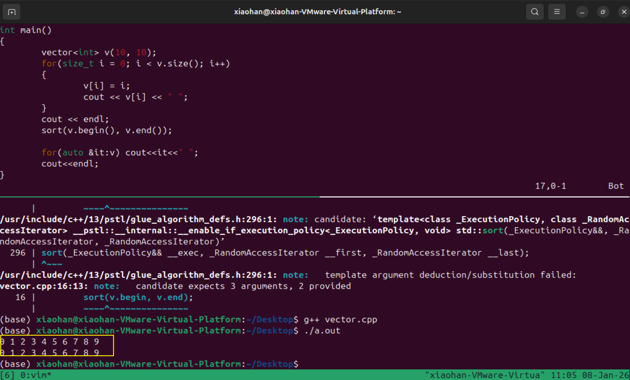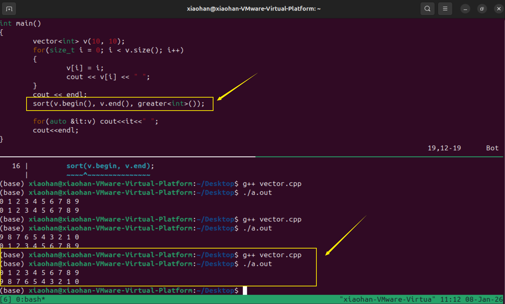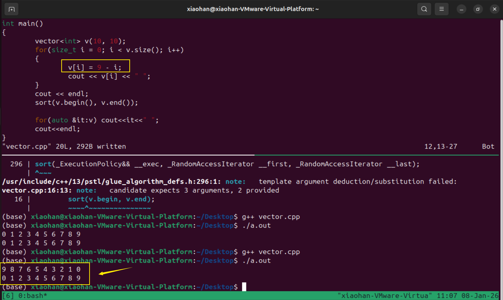 修改程序vector为从9到0,之后再进行排序输出,说明排序生效了