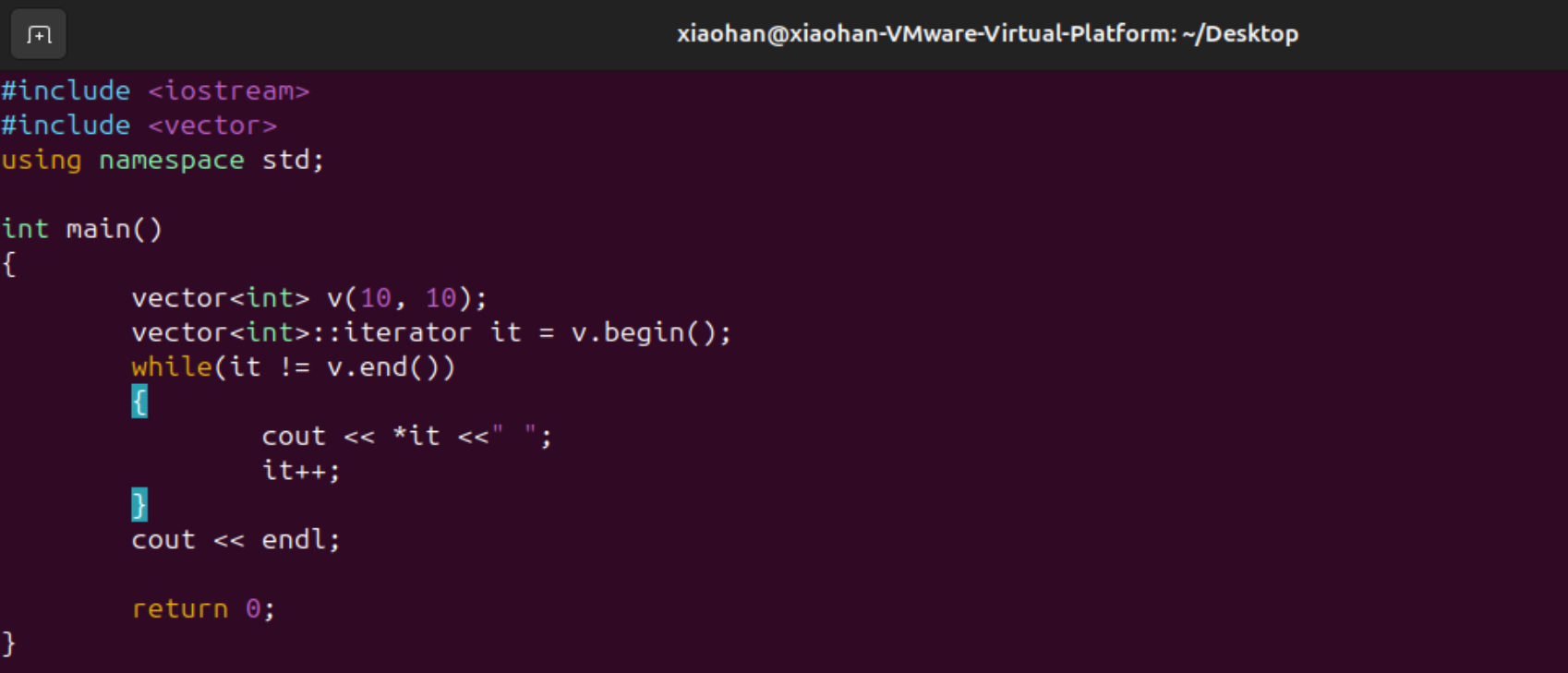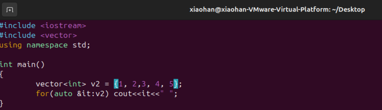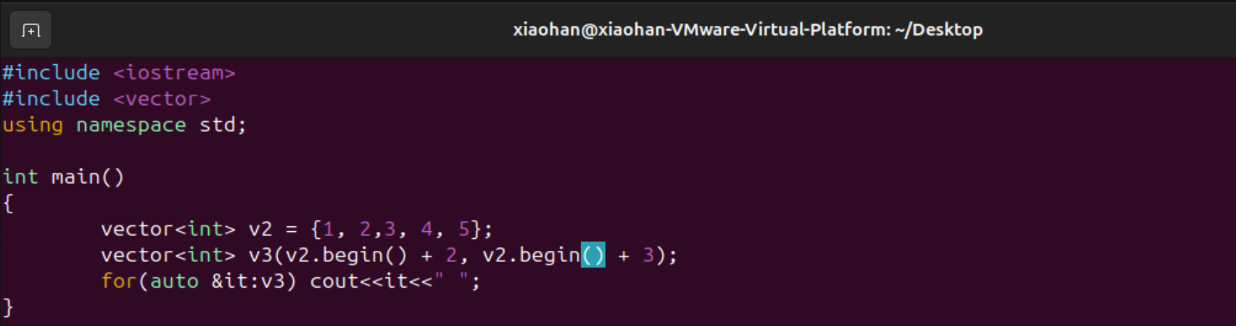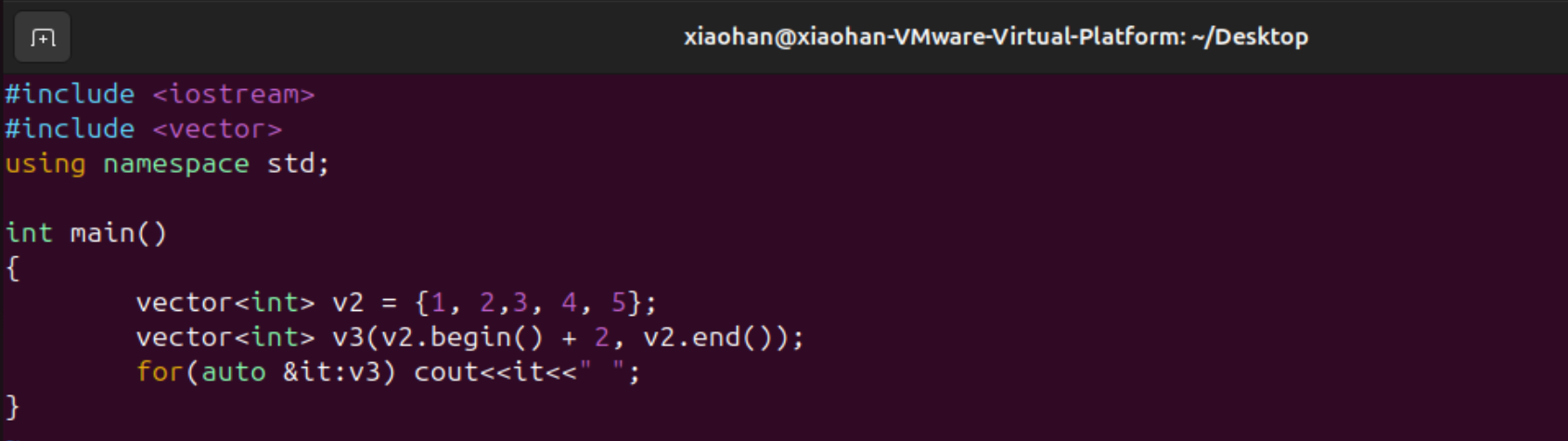 已经有了某个vector,下面想新创建一个vector,但是这个vector用前面vector的一部分信息,下面利用v2来创建v3,代码如下图所示,用v2的迭代器区间来初始化v3。