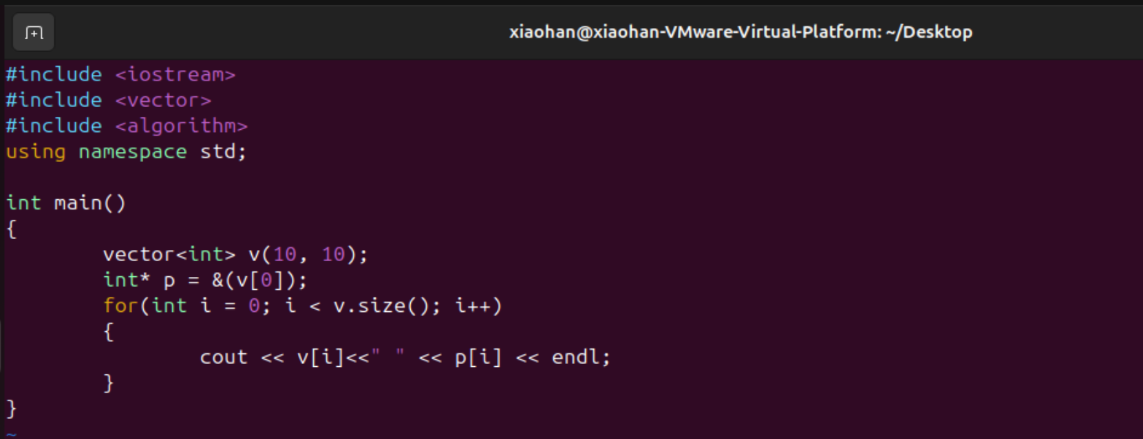 要把vector转为一个指针只需要对首元素取地址即可,首先定义一个10个10的vector,之后取周哥元素的地址,遍历读取,观察取值是否一致。