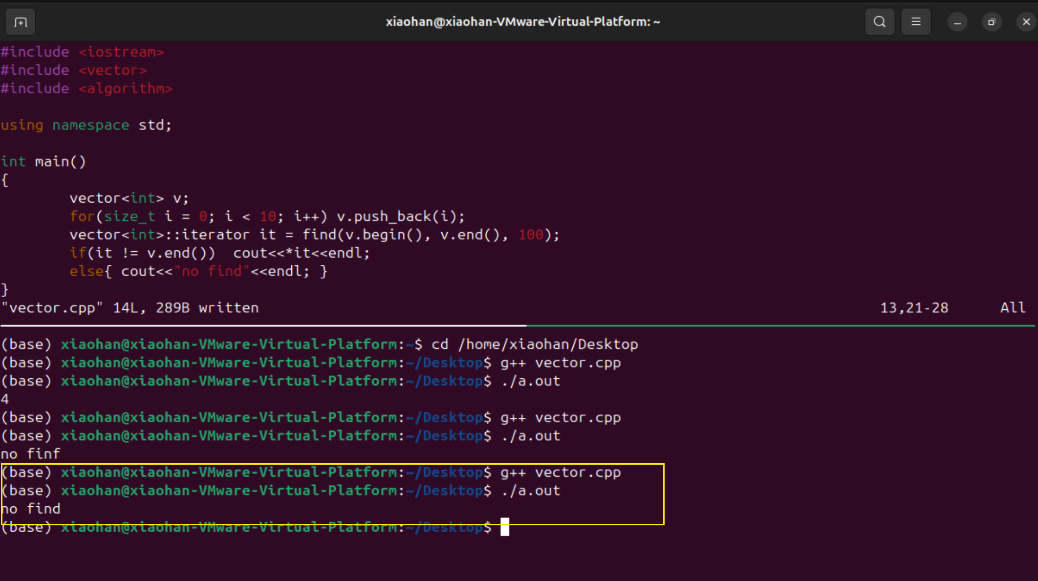 下面完善一下程序,在vector中查找100这个元素,由于不包含这个元素,所以没有