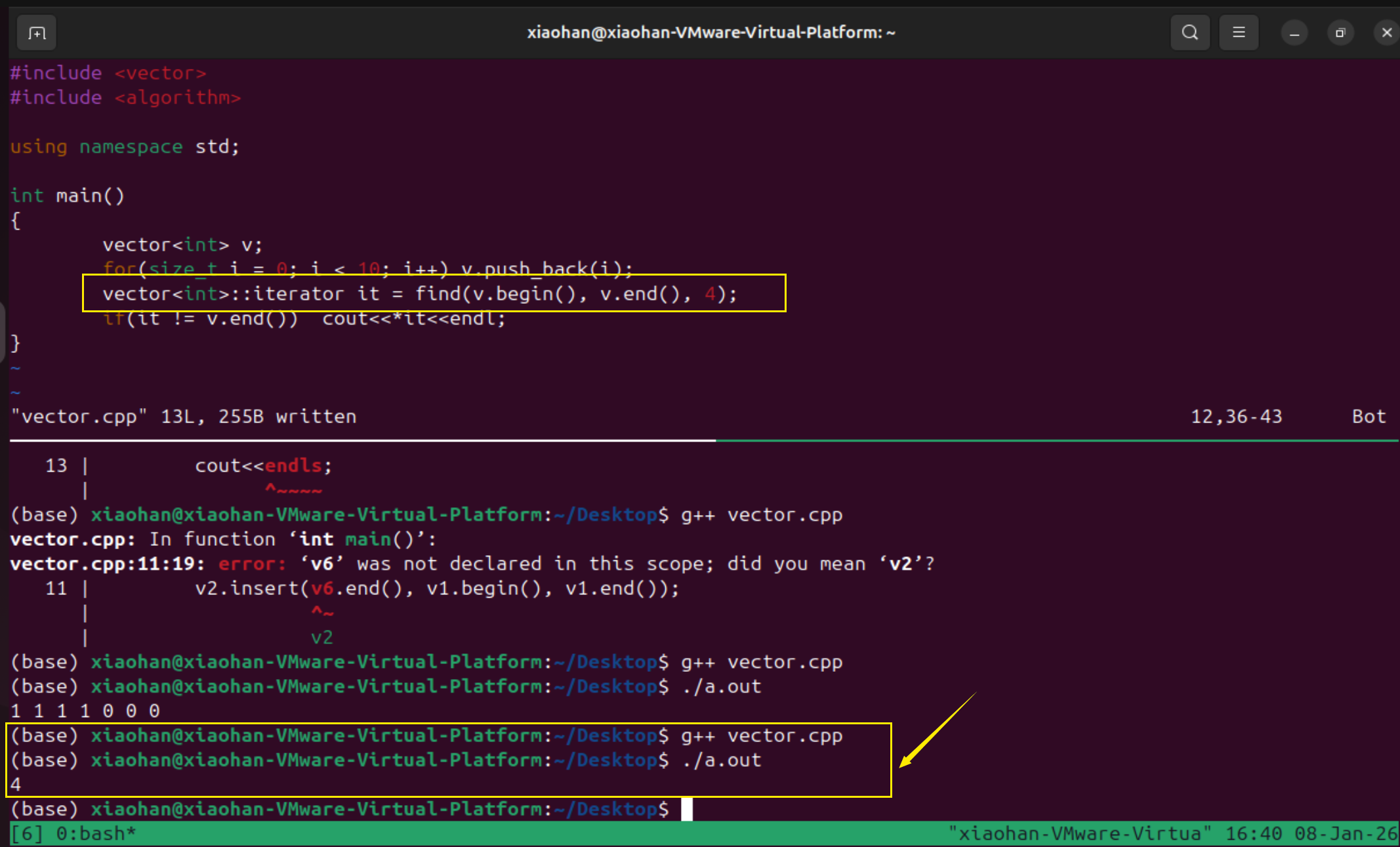 查找某个元素是否在vector内,下图程序是通过find函数查找元素4的位置