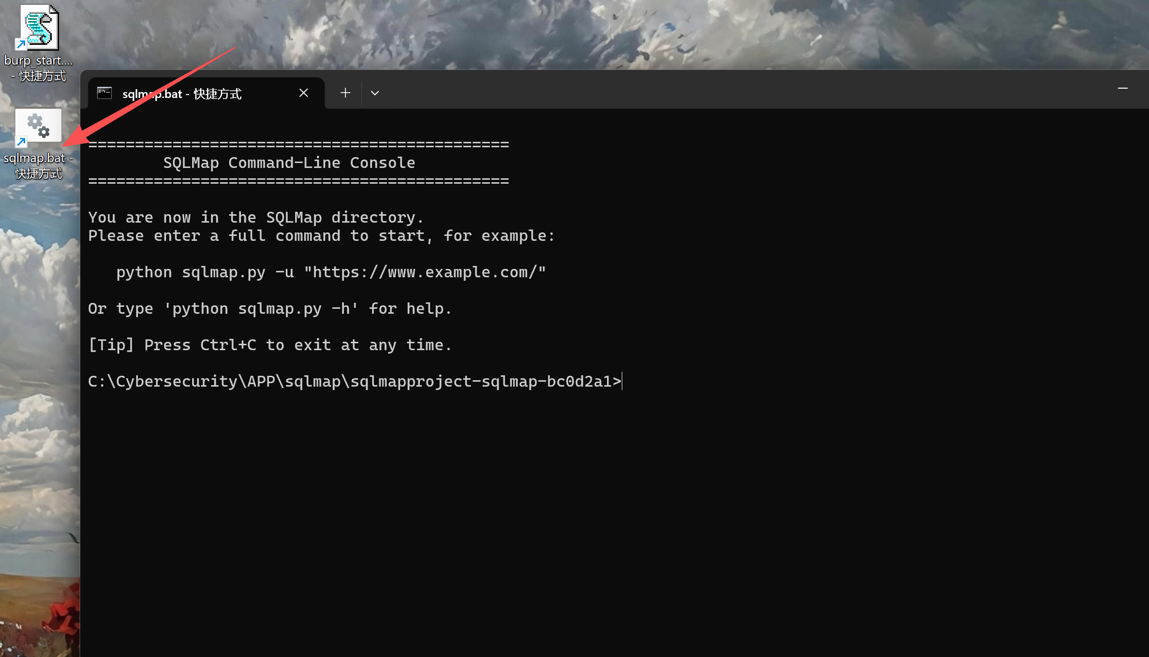 将脚本快捷方式到桌面,直接就能进入sqlmap环境了。