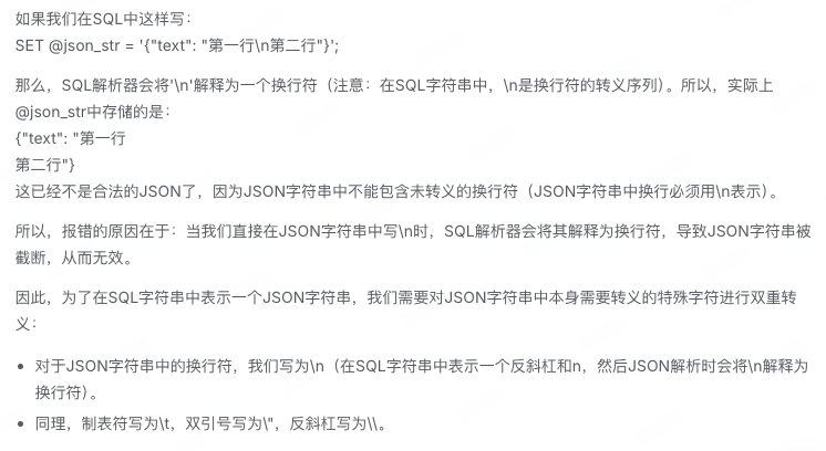 - 由于JSON字符串中换行必须用\n表示,也就是说 原来的 字符串 在被 解析后 , 得到 的应该是 XXX\n XXX (合法的) ,但是由于没针对反斜杠符号 进行转义(也就是写成 \n 这样 解析后就会成 \n), 所以 直接被 解析成了换行符, 最终结果变成了