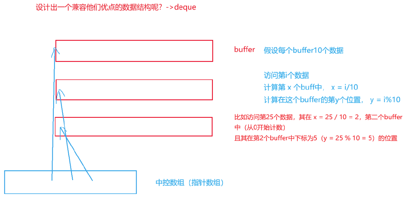 deque就是一个被设计出来用来尝试兼容二者优点的数据结构,但是最终从结论来看deque是一个半成品