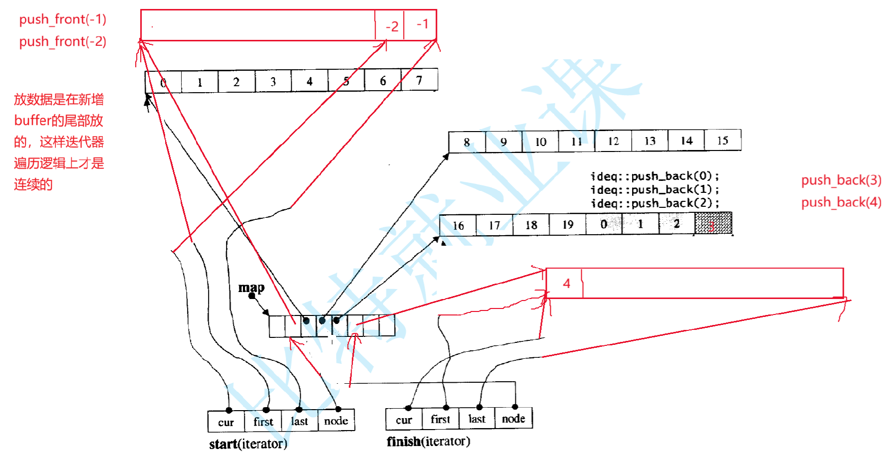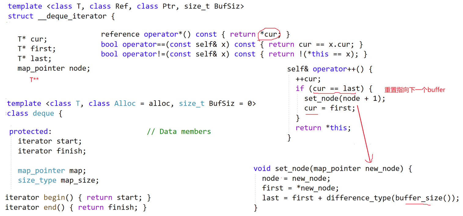 - 若cur到达last(当前缓冲区末尾),则通过node(++node)找到中控器里下一个缓冲区的指针,然后将first/last切换为新缓冲区的起止,cur指向新缓冲区的first(实现跨缓冲区遍历);