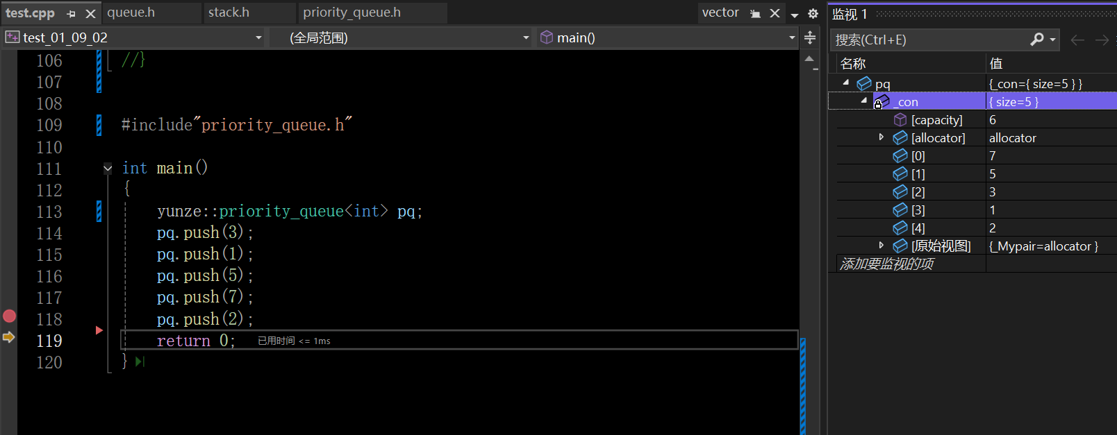 yunze::priority_queue<int> pq(a, a + 5);