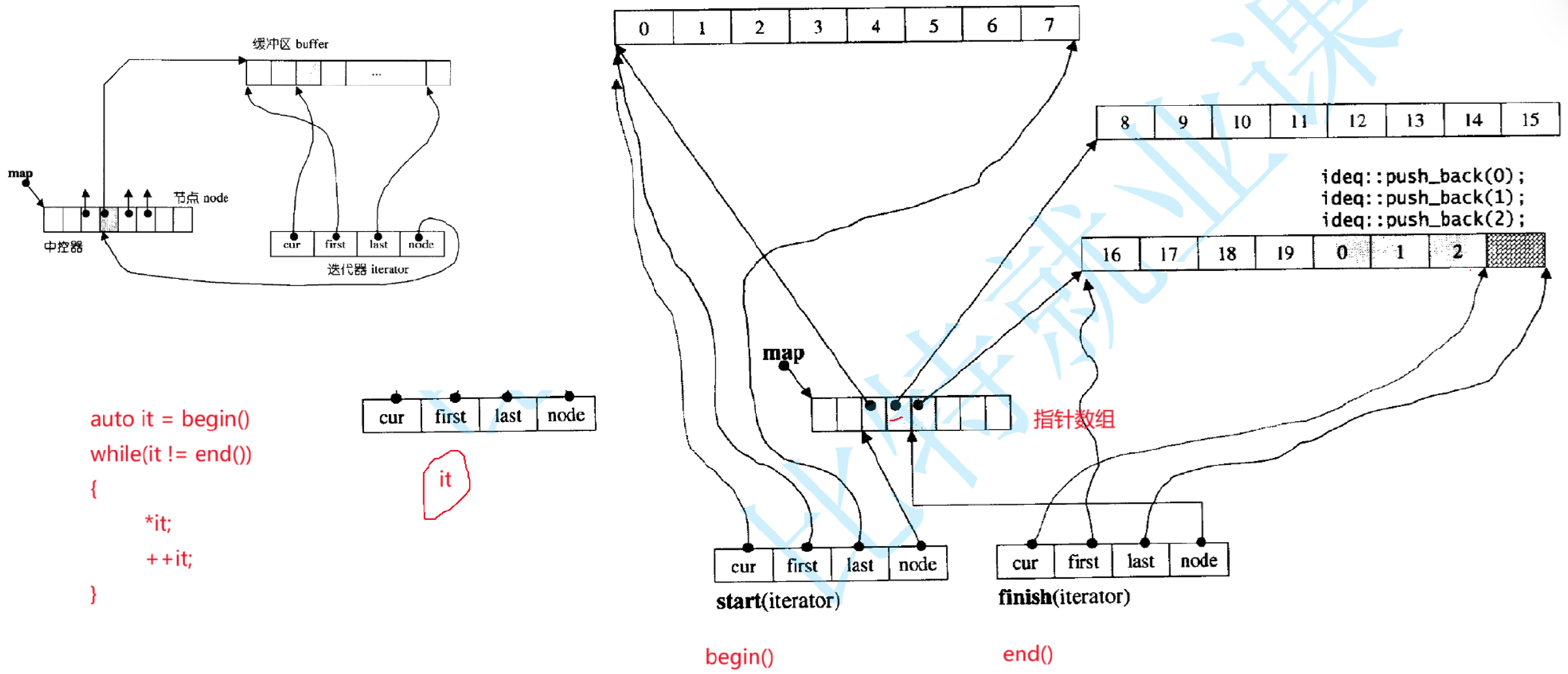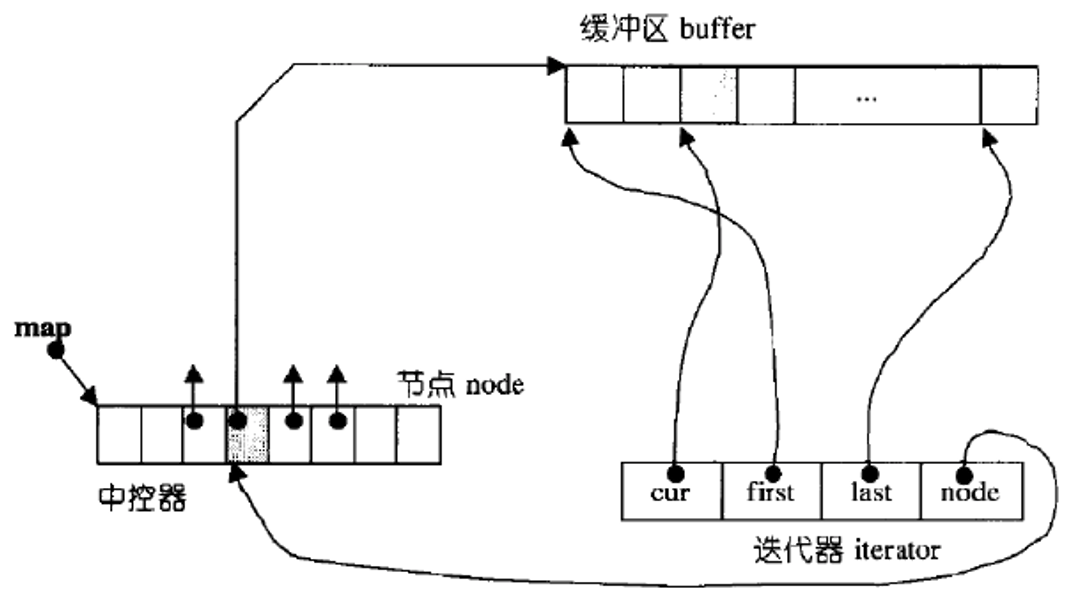 cur:指向当前缓冲区中正在访问的元素 (如图中迭代器的cur指向某个元素);