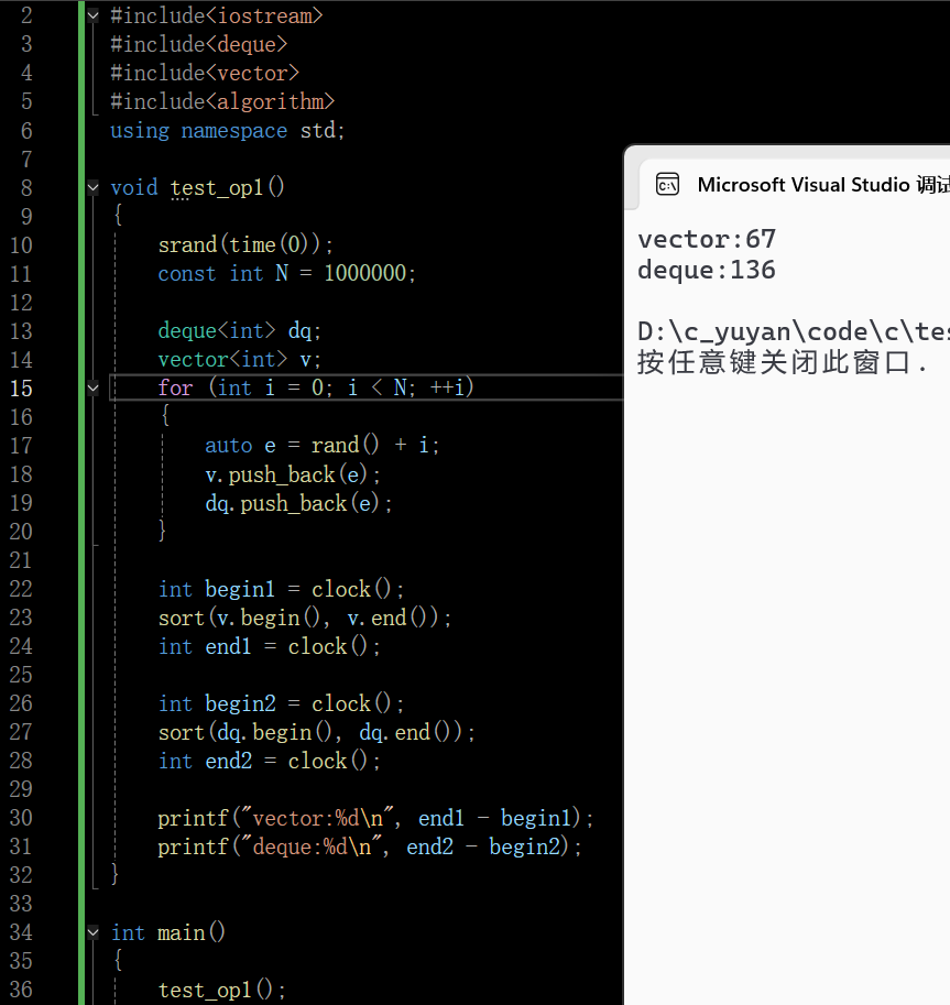 这里是用STL中的sort间接体现 deque 的随机访问效率劣势,STL 的sort的核心要求是容器支持随机访问迭代器 ,且排序过程中会频繁执行随机访问操