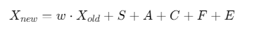 new_pos = w*pop(i,:) + s*S + a*A + c*C + f*F + e*E;
