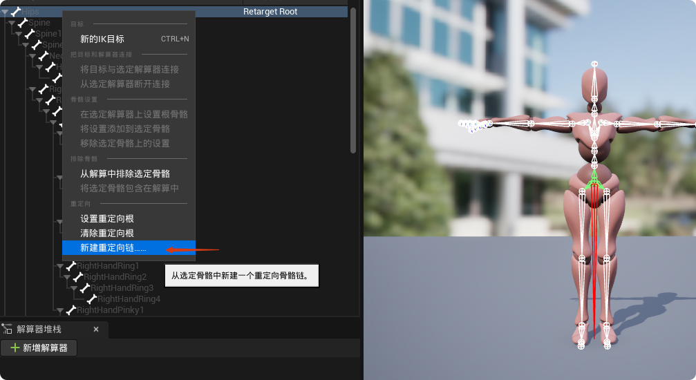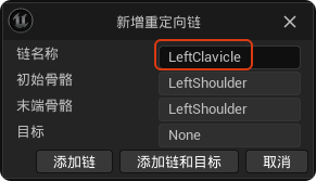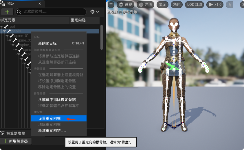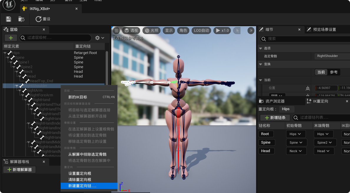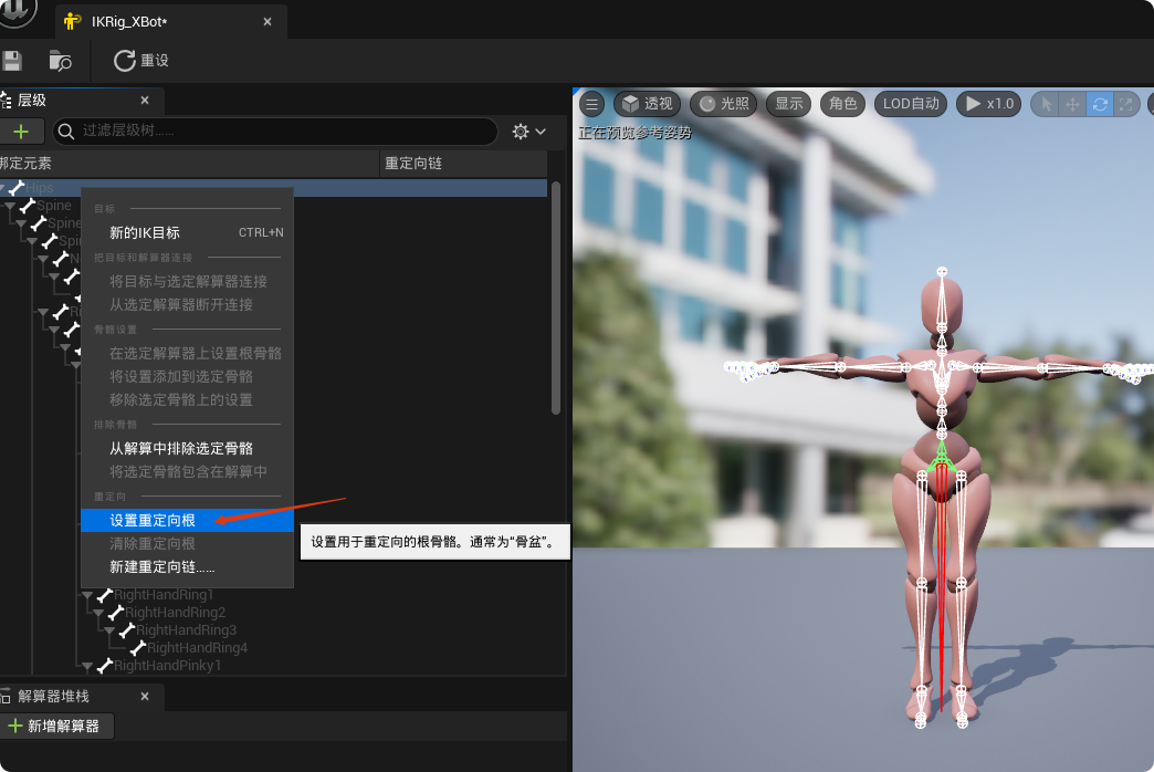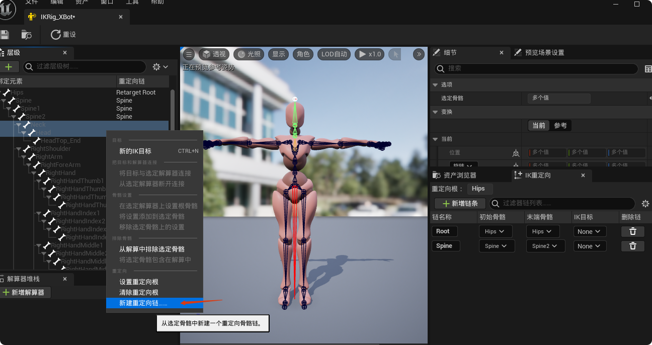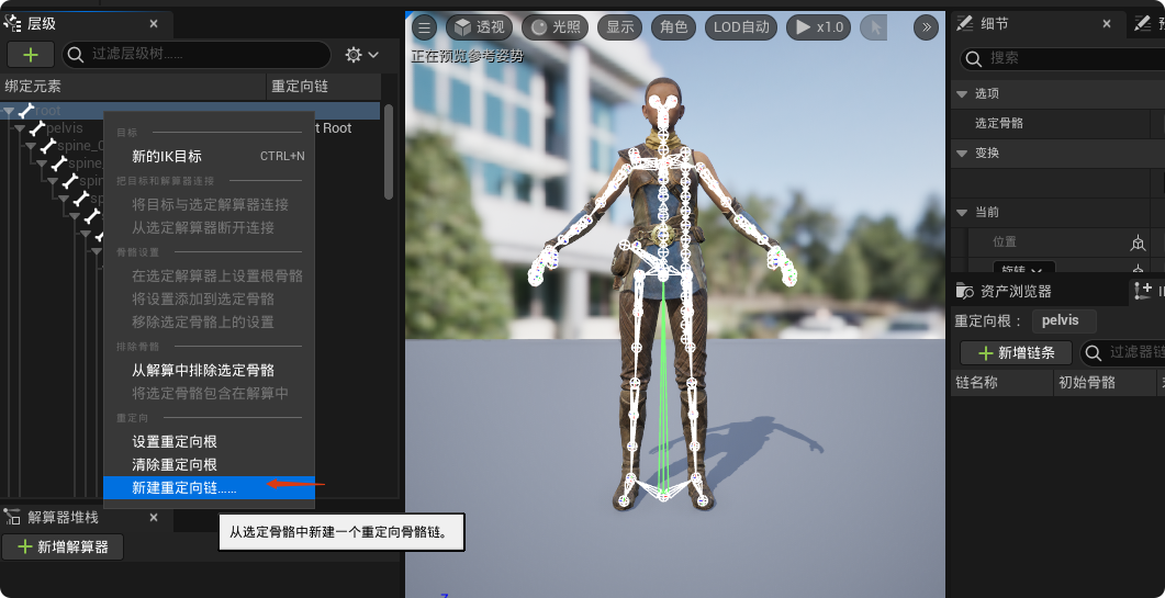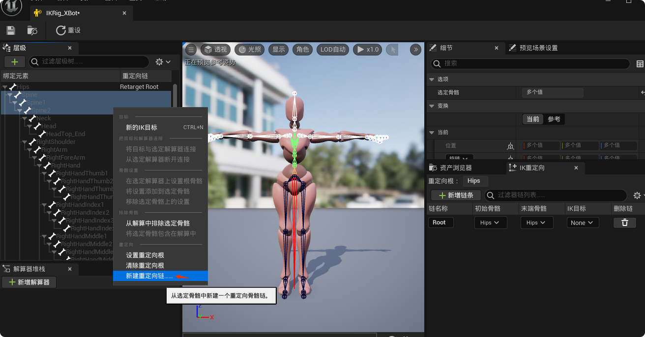接下来只需要创建与"IKRig_XBot"那些链条相对应的链条即可。首先设置骨骼"pelvis"为重定向根。