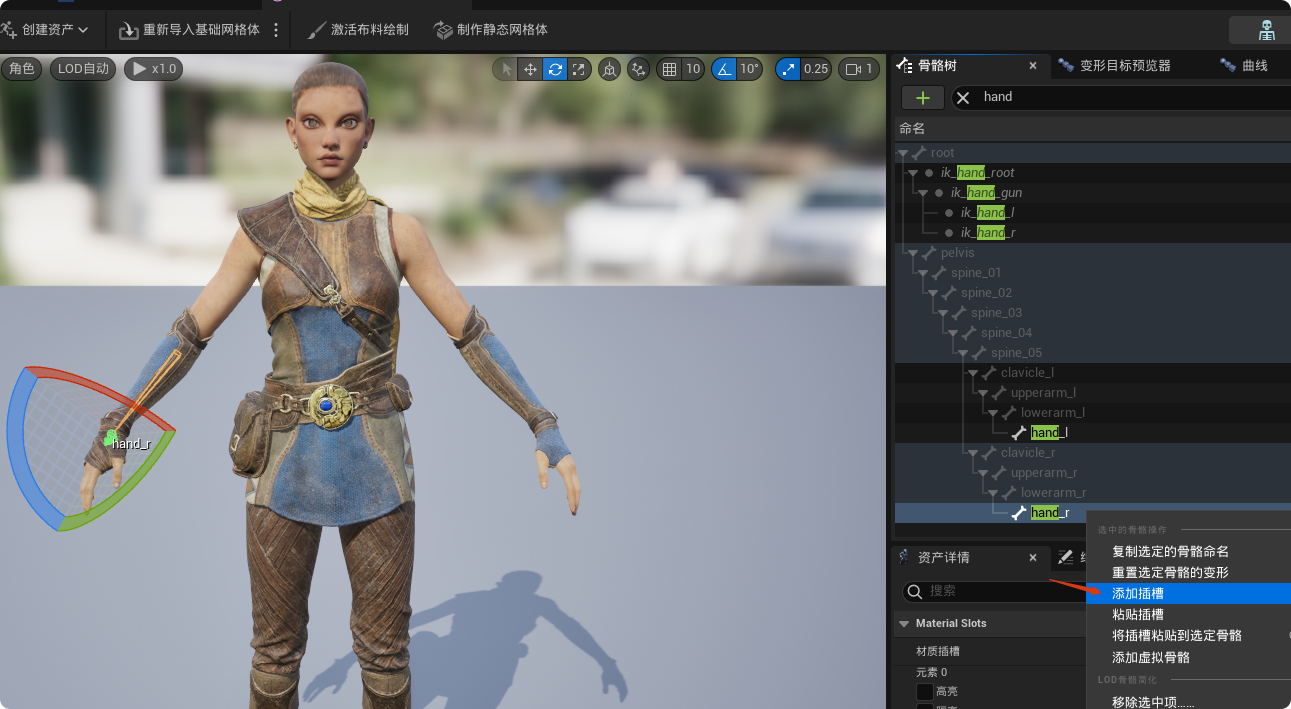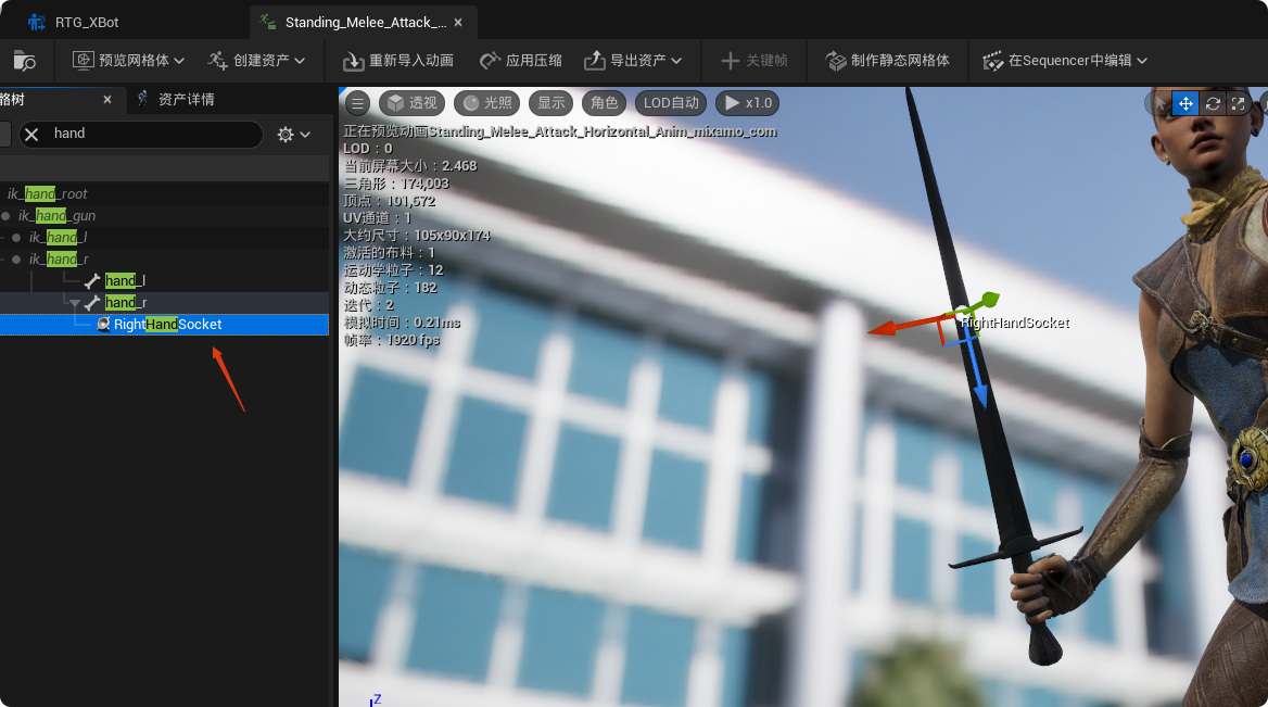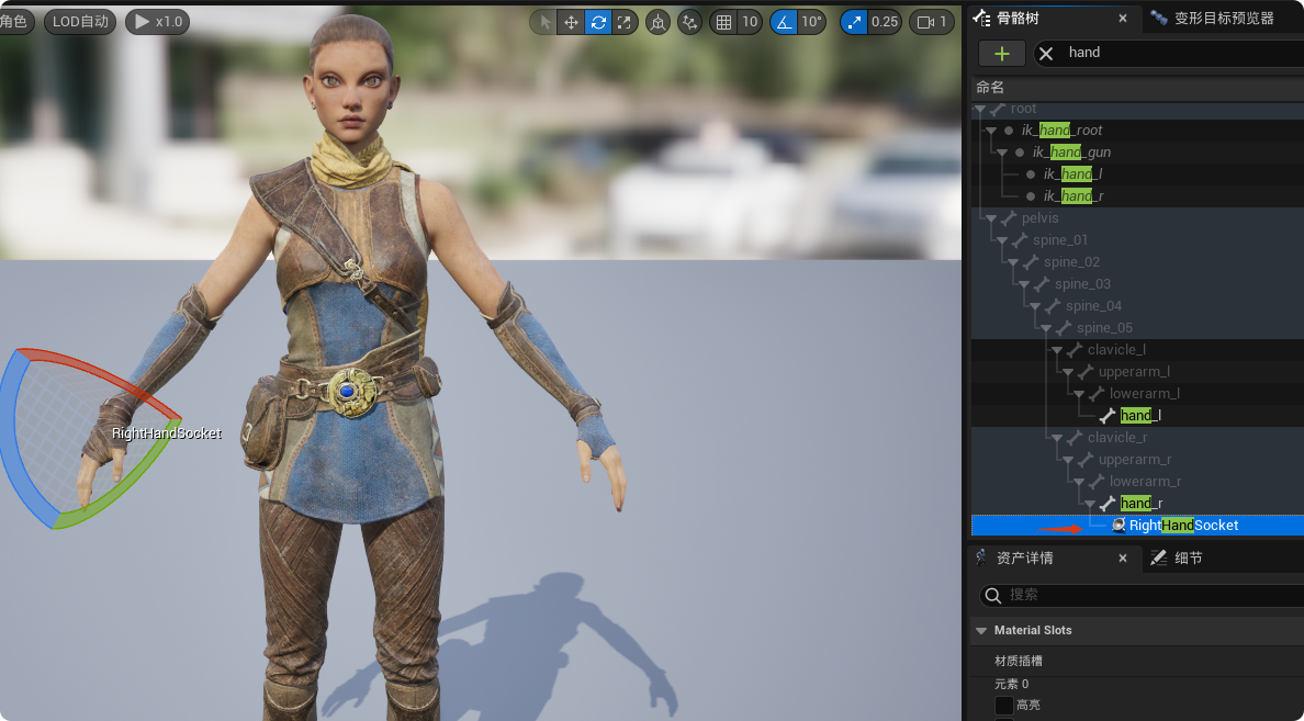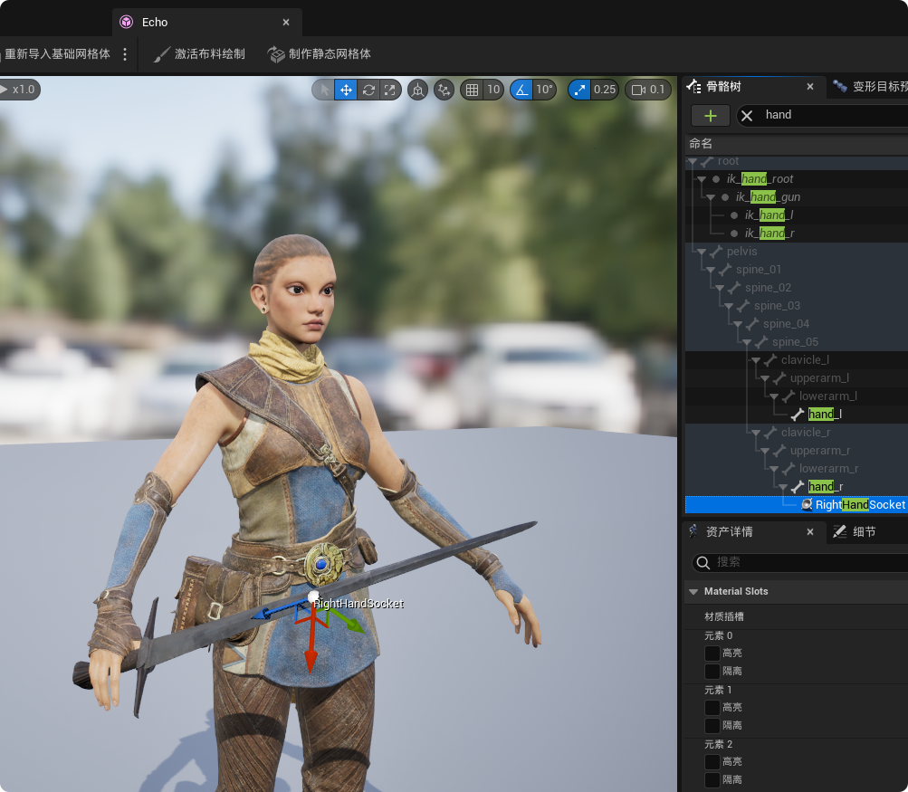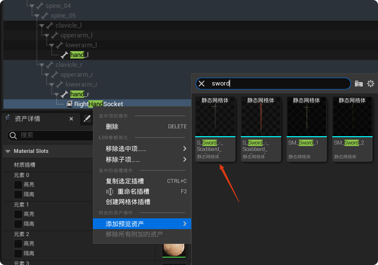 现有有了剑,接下来要解决的问题是如何让剑握在角色手里,这里用到的是scokets,可以用来将actor添加到骨骼网格体的骨骼上。