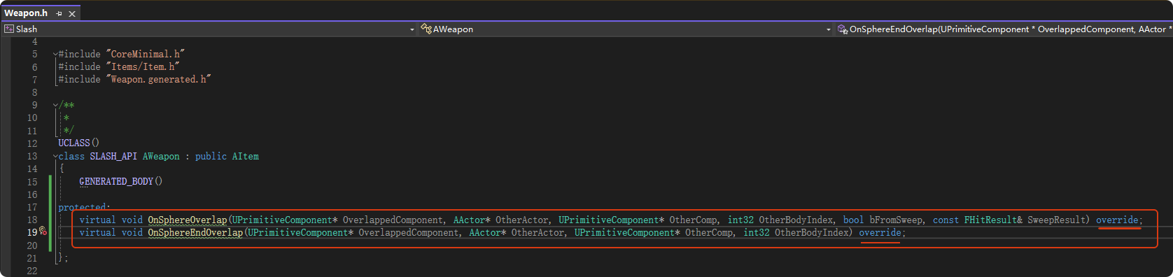 在"Weapon.h"中申明重写父类的OnSphereOverlap和OnSphereEndOverlap函数
