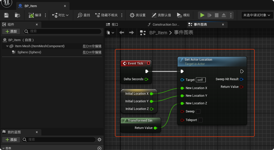 在"Item.cpp"中每帧更新当前运行时间"RunningTime",TransformedSin输出初始Z坐标加上正弦函数值