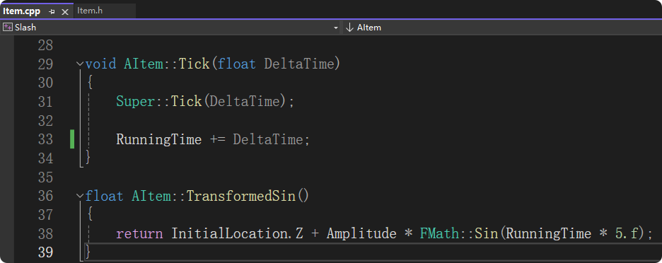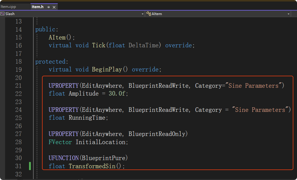 首先在该类中实现上下浮动的功能,这里根据公式的规律来让item在Z轴方向上下运动。因此这里在"Item.h"中定义如下3个变量和1个函数,Amplitude为公式中的A(振幅),RunningTime为公式中的t。InitialLocation表示item的初始位置。TransformedSin()用于得出公式中的z值。