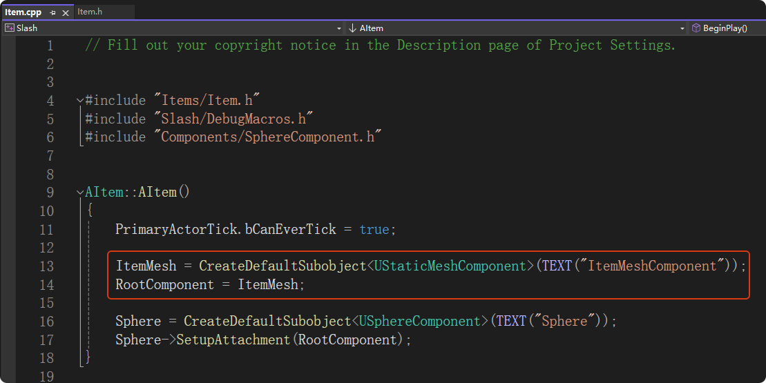 在"Item.cpp"构造函数中创建球形碰撞组件,注意需先引入头文件: