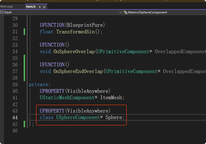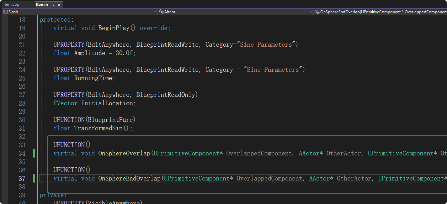 定义OnSphereOverlap和OnSphereEndOverlap函数,表示有物体接触和离开item碰撞检测区域后要做的事。使用virtual关键字是为了在子类Weapon中重写这两个函数。