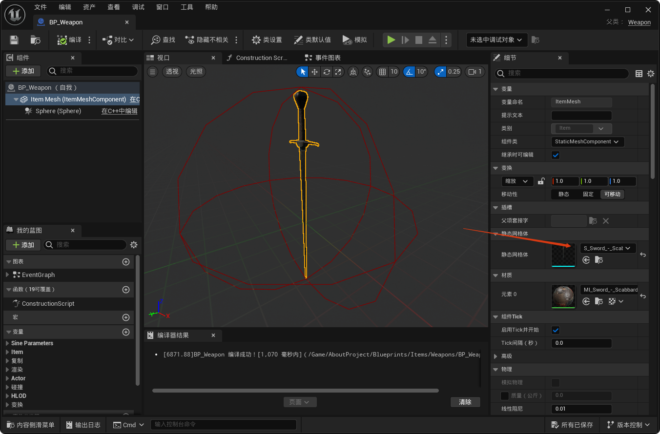 打开"BP_Weapon",设置静态网格体,并修改球形碰撞区域半径以适应网格体大小