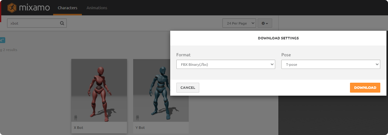 访问Mixamo,由于Mixamo动画不能直接用在我们的角色上,因此先下载Mixamo角色"XBot"