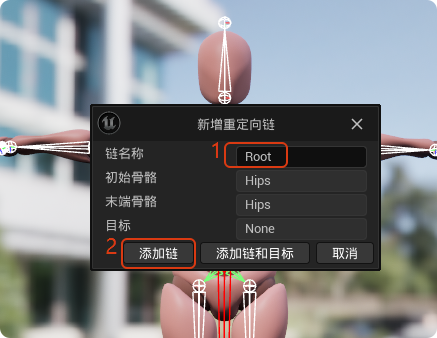选择Root骨骼,新建重定向链,这里链名称同样设置为"Root"