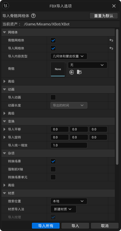 将下载后的.fbx文件导入UEEditor,直接点击"导入所有"