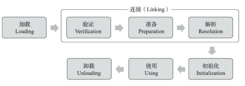 (Initialization)、使用(Using)和卸载(Unloading)**七个阶段,其中验证、准备、解析三个部分统称为连接(Linking),前 5 个阶段(加载、验证、准备、解析、初始化)属于类的 "加载过程"。
