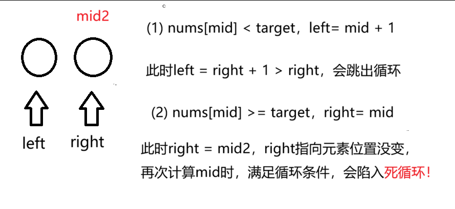 - 当n[mid] >= target 时,right = mid1 = right ,满足循环条件left < right ,下一轮计算出的mid还是等于right ,因此会陷入死循环!