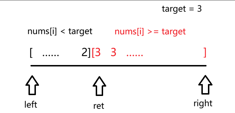 - 在**[ret, right** ]区间中,任意下标 i,都满足nums[i] >= target。