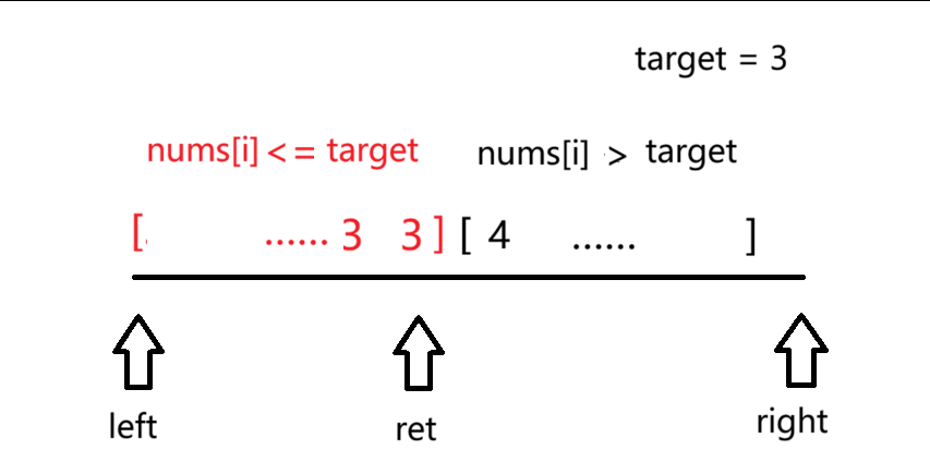 - 在**[left, ret** ]区间中,任意下标 i,都满足nums[i] <= target。